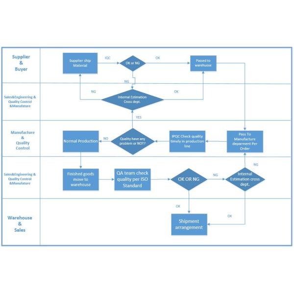 Our quality team included by IQC, IPQC, QA and Document control team. Document control response manage all company’s document. To make sure document original stock in safety and newest version was in public. IQC team response to incoming material quality control and support buyer audit supplier in time. IPQC support on production line to make sure quality issues would be found in time instead of after finished goods was done. And feedback the potential quality issues to manufacture department to avoid heavy quality accident happened. QA team would be the 3rd gate before the cargo ship to customer and market. In all processing of quality control, not only the quality control department take care the quality. But also Sales and Engineering, buyer, Etc. were involved into all quality control procedure. That is why quality concept was inculcated in all our company cross department.